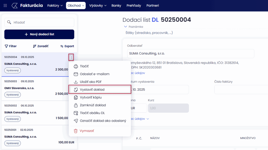 Vyberte jeden dodací list ktorý chcete fakturovať. Kliknite na príznak vpravo a zvoľte „Vystaviť doklad“