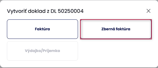 Vyberte typ dokladu ktorý chcete vystaviť z dodacieho listu. Chceme vytvoriť faktúru z viacerých dodacích listov v tomto prípade to bude „Zberná faktúra“.