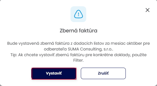- Aplikácia automaticky do faktúry doplní len dodacie listy aktuálneho mesiaca. Pri tvorbe zbernej faktúry z konkrétnych dokladov, je potrebné použiť filter.