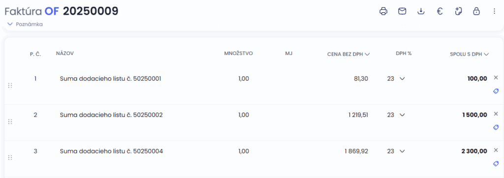 Aplikácia automaticky do položiek faktúry zapíše čísla dodacích listov aktuálneho mesiaca, za daného partnera , aj s celkovou sumou dodacieho listu.