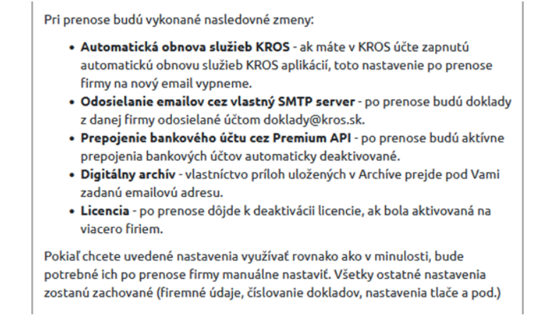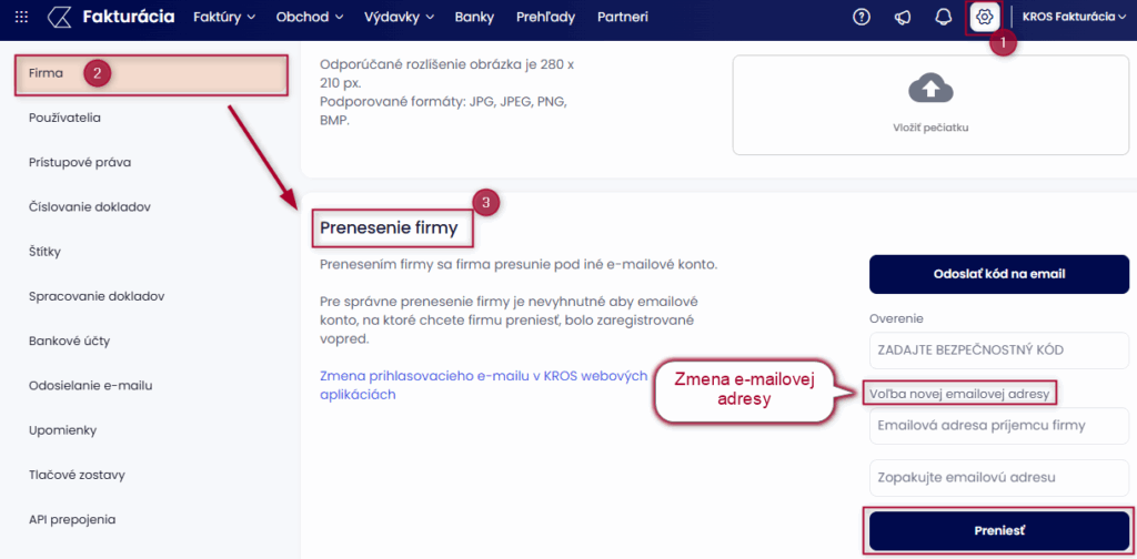 Zmenou vlastníka (prihlasovacieho e-mailu) sa firma prenesie pod iný aktívny KROS účet, pričom sa prenesie celá firma, tzn. KROS Fakturácia, KROS Digitálna kancelária aj KROS Sklad.