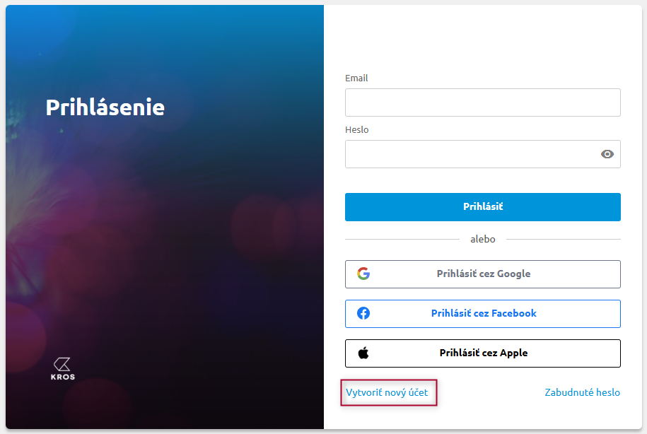 Je potrebné aby bol nový e-mail, zaregistrovaný v KROS účte ešte pred zmenou. Prvé prihlásenie nového e-mailu urobte cez – Vytvoriť nový účet.