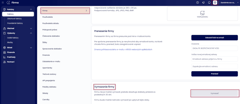 Ak ste za posledných 30 dní nepridávali doklady, firmu môžete vymazať cez horné pravé menu (ikonka ozubeného kolieska) v časti “Vymazanie firmy”. Uistite sa, či údaje už skutočne nebudete potrebovať a firmu môžete natrvalo vymazať.
