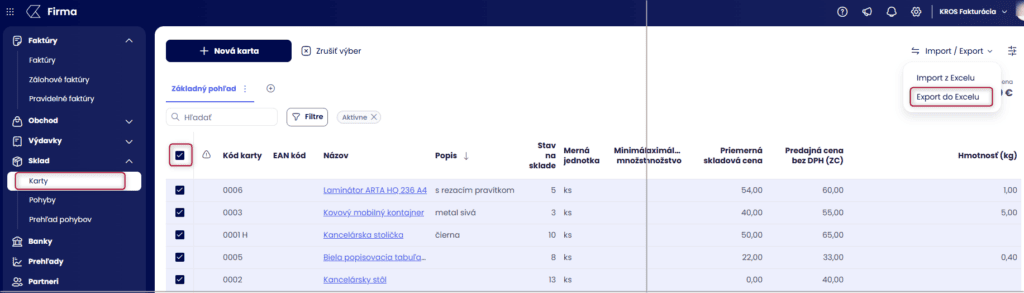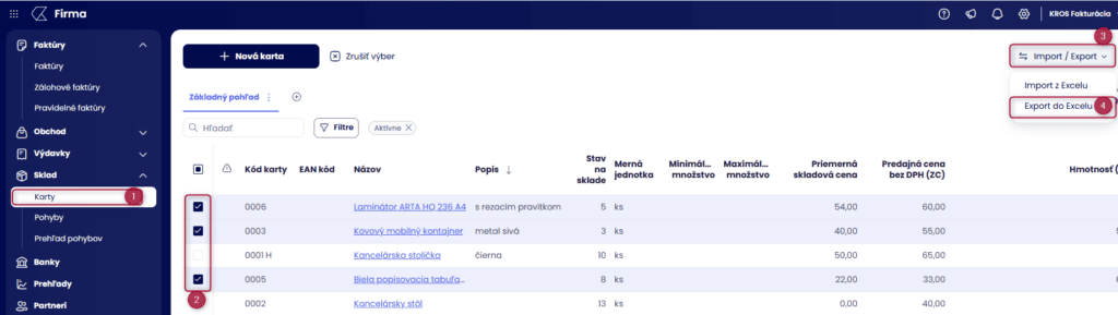 Import a export skladových kariet v KROS Firme