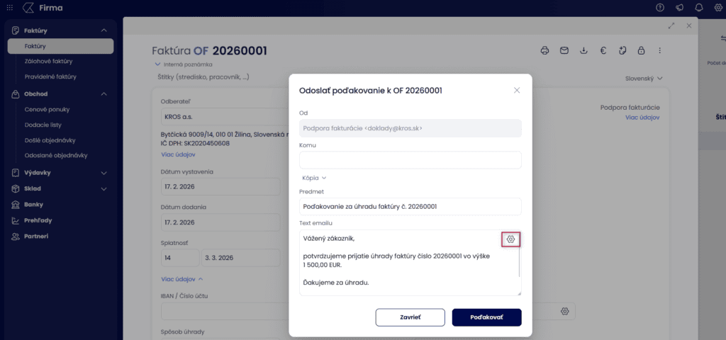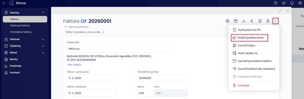 Pri uhradených faktúrach automaticky pribudne možnosť Poslať poďakovanie. Funkcia je prístupná iba pri faktúrach s kladnou sumou, ktoré majú príznak Uhradená.