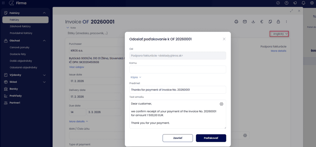 V prípade faktúry v cudzom jazyku sa naša predloha textu s poďakovaním automaticky zobrazí v danom jazyku.