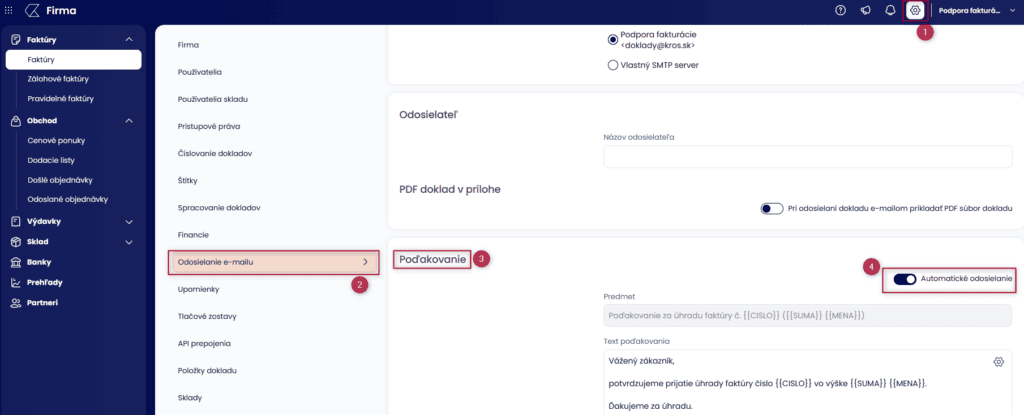 Okrem manuálneho zasielania poďakovania priamo pri doklade, viete nastaviť aj automatické poďakovanie.