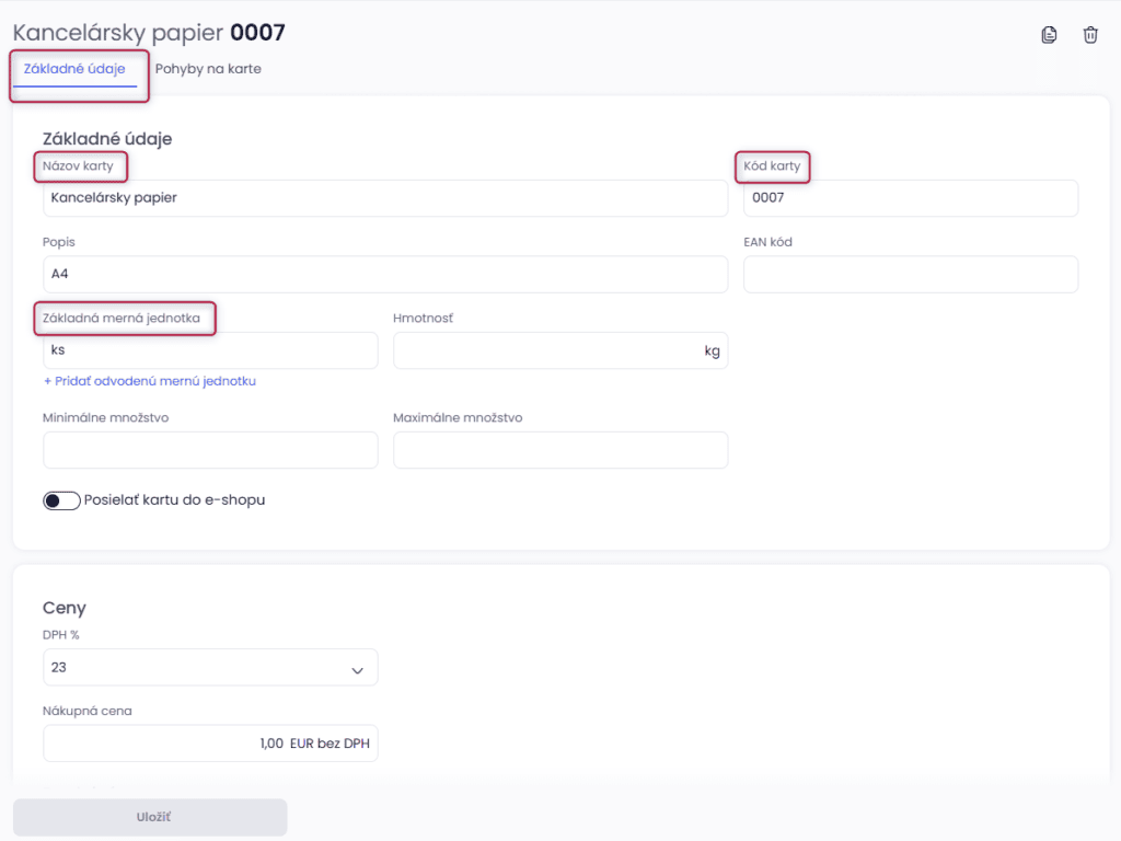 - Popis – doplňujúce informácie o skladovej karte.