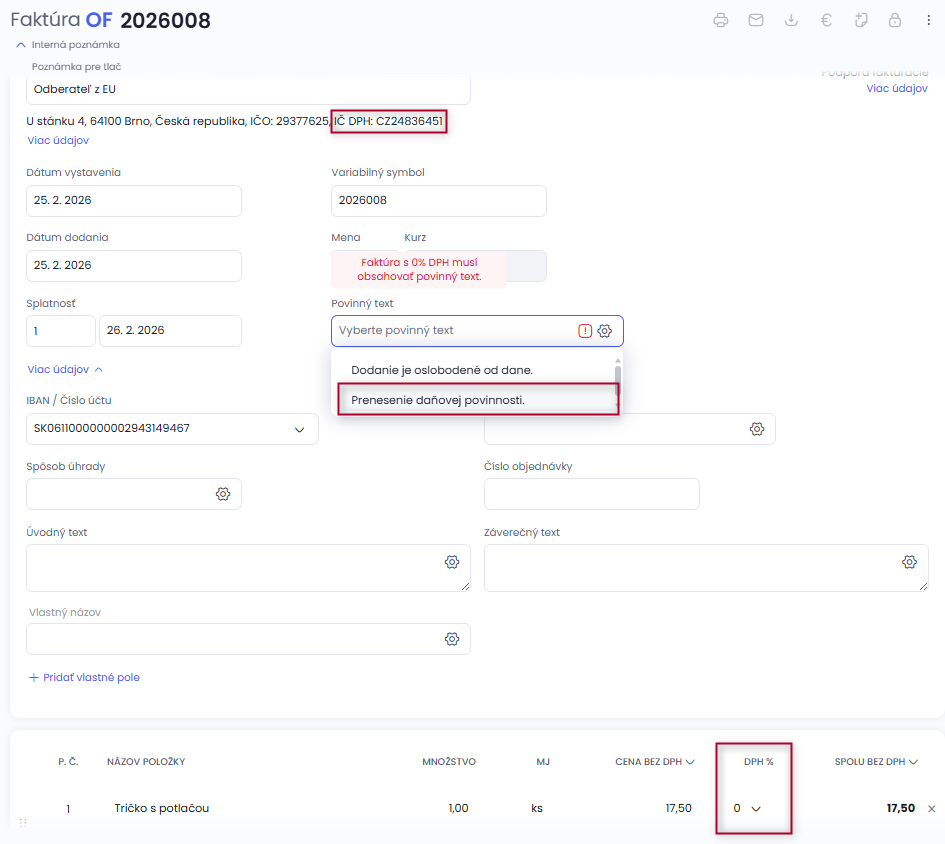 Keď vyberiete partnera so zahraničným IČ DPH (s iným prefixom ako SK):