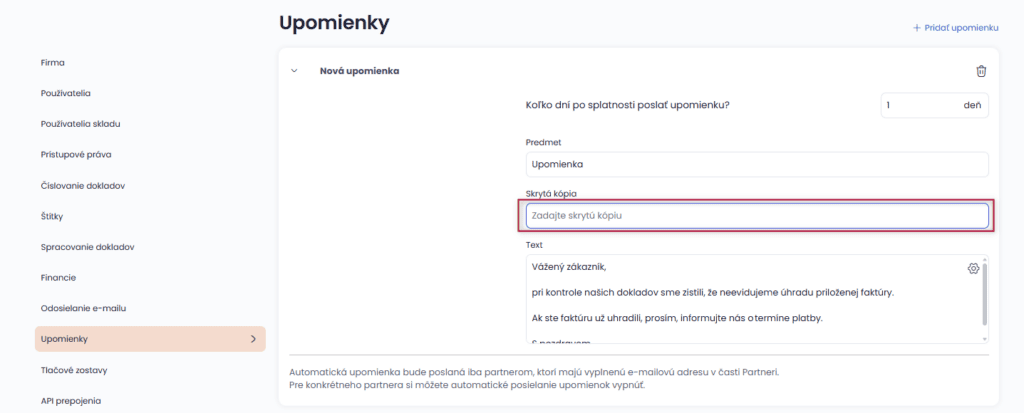Nastavenie skrytej kópie, pri automatickom odoslaní upomienky: