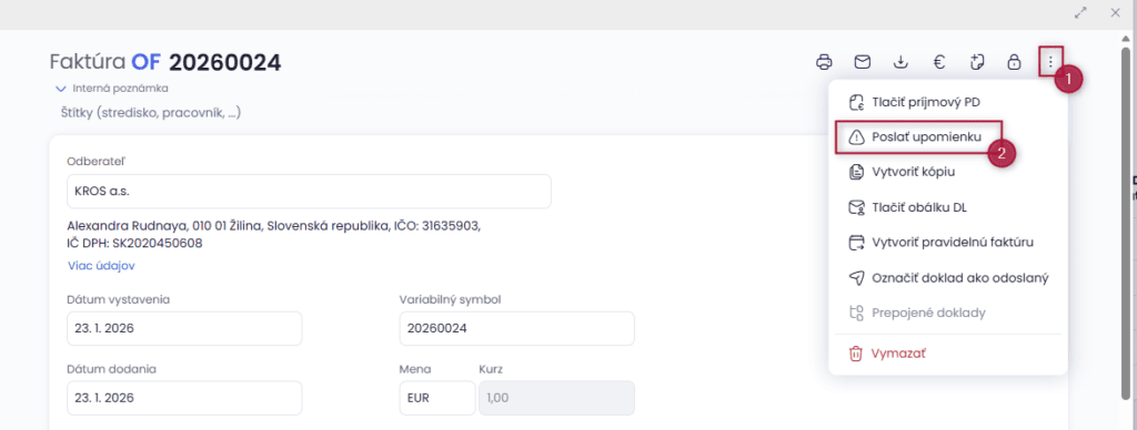 V zozname faktúr si dvojklikom otvoríte faktúru, ku ktorej chcete poslať upomienku (faktúra musí byť buď neuhradená, prípadne čiastočne uhradená a po splatnosti), následne kliknete na tri bodky a potvrdíte voľbu Poslať upomienku.
