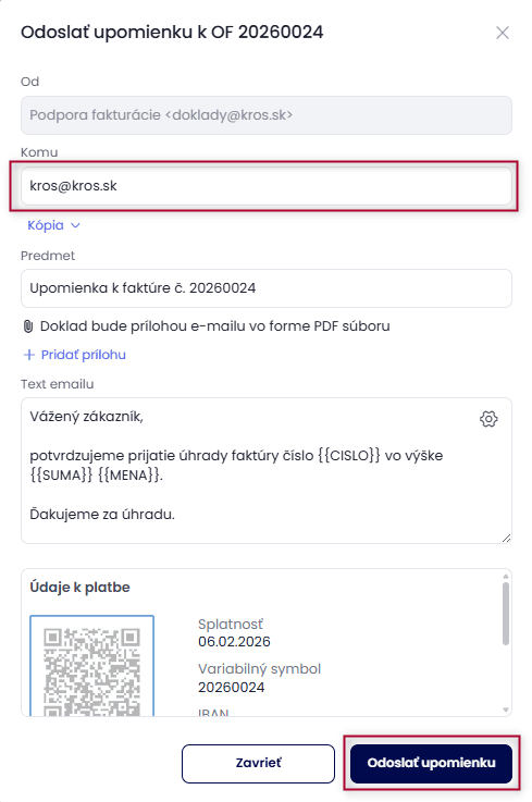 Pred odoslaním upomienky je potrebné vyplniť e-mailovú adresu, na ktorú chcete upomienku poslať. Pokiaľ máte e-mail k partnerovi vyplnený v záložke Partneri, vyplní sa automaticky. Text upomienky je editovateľný. Nakoniec už len stačí Odoslať upomienku.