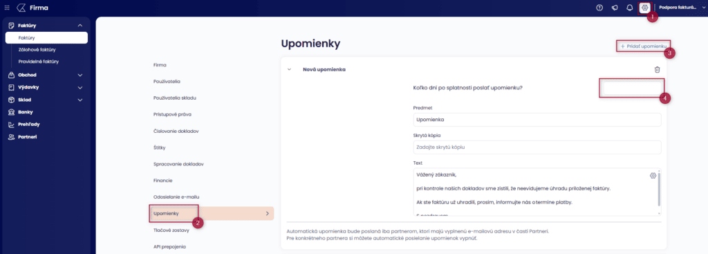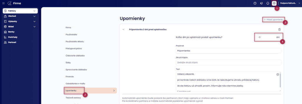 Nastavíte si tu, koľko dní po splatnosti chcete upomienku poslať, k tomu príslušný text a celé nastavenie uložíte.