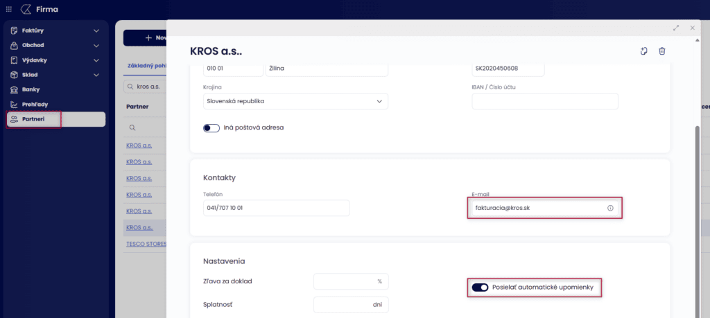 Pri automatickom posielaní upomienok je potrebné mať nastavenú e-mailovú adresu na karte partnera. Pokiaľ nechcete vybraným partnerom upomienky posielať, stačí vypnúť voľbu Posielať automatické upomienky.