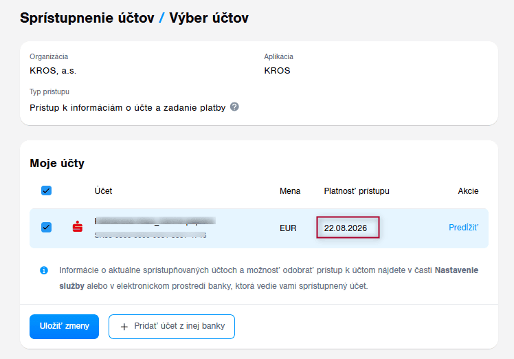 Pokiaľ užívateľ prepája viaceré účty s firmou v KROS Firme, pre správne fungovanie prepojenia je potrebné mať pri všetkých prepojených účtoch rovnaký dátum platnosti prepojenia. V opačnom prípade prepojenie nebude fungovať správne.