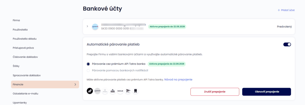 Sekcia Financie rovnako umožňuje zrušiť prepojenie s bankou cez možnosť Zrušiť prepojenie, alebo pridať ďalší účet cez možnosť Obnoviť prepojenie.