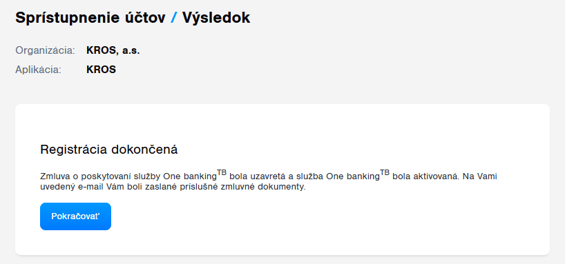 Po vyplnení a odoslaní registračného formulára obdrží používateľ informáciu o vytvorení prepojenia.