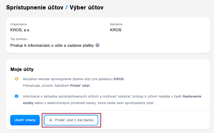 Dokončením registrácie v službe One Banking si užívateľ KROS Firmy prepojí jeden alebo viaceré bankové účty cez možnosť + Pridať účet. Výberom konkrétnej banky je užívateľ presmerovaný do svojho internetbankingu, kde prepojenie potvrdí.