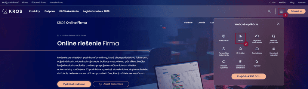 Ďalší spôsob prihlásenia je priamo z našej web stránky https://kros.sk . Cez menu aplikácií zvoľte možnosť Firma.