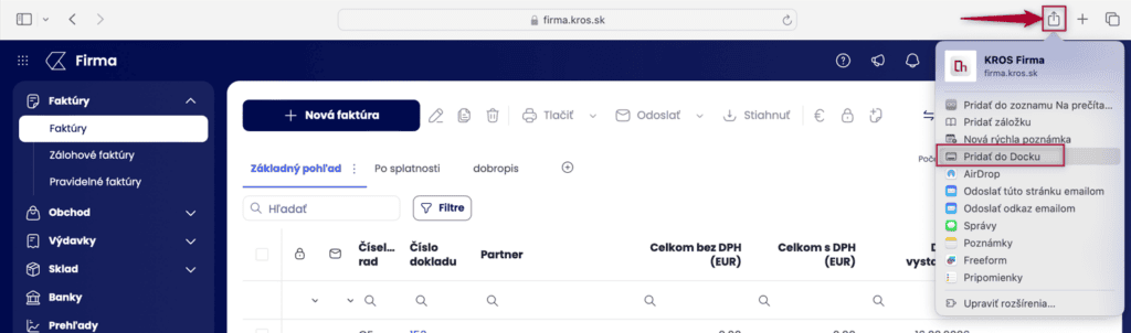 - V Safari zvolíte ikonu štvorca so šípkou a vyberiete možnosť Pridať do Docku.