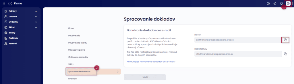 V časti Nastavenia – Spracovanie dokladov nájdeme preddefinované e-mailové adresy, na ktoré je potrebné preposielať doklady. Ak chceme zber dokladov ešte viac zefektívniť, môžeme túto zbernú e-mailovú adresu poskytnúť priamo svojim dodávateľom. Nielenže sa tak zníži riziko straty dokladov, ale urýchli sa aj proces ich odovzdávania.