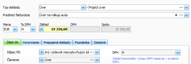 - typ dokladu vyberte Úver – Prijatý úver,