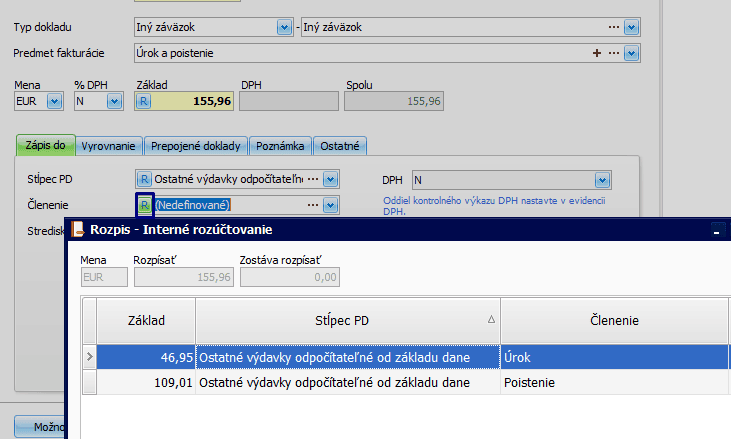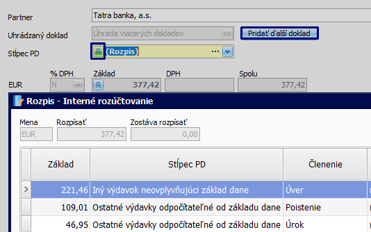 - stĺpec PD vyberte Iný výdavok neovplyvňujúci základ dane, prípadne doplňte členenie.