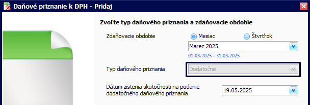 - vo formulári vyberte mesiac prípadne štvrťrok, za ktorý vytvárate dodatočné priznanie a Typ daňového priznania vyberte Dodatočné,