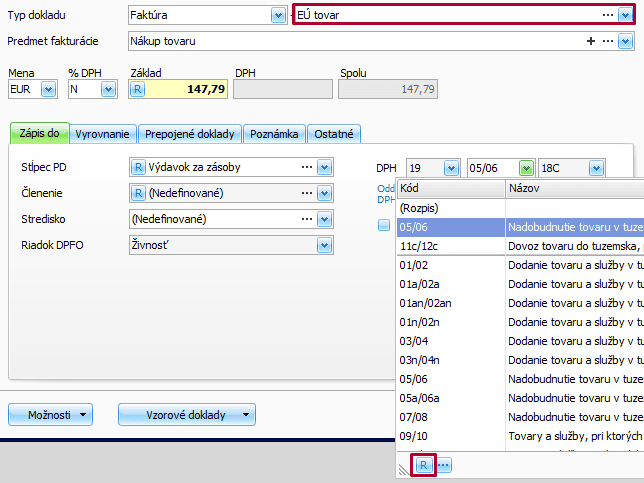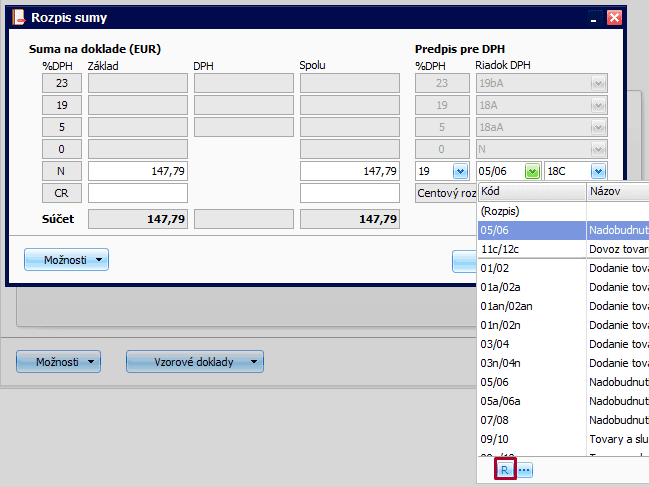 - V rozpise sumy v riadku DPH opäť kliknite na R, pre rozúčtovanie podľa jednotlivých sadzieb DPH: