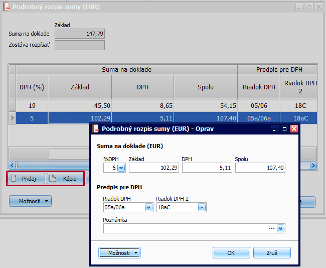 - V Podrobnom rozpise si upravíte sumy podľa príslušných sadzieb cez tlačidlo Pridaj alebo Kópia nasledovne: