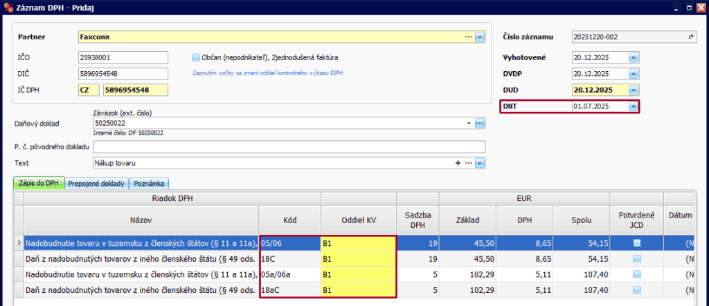 - V poli DNT – Dátum nadobudnutia tovaru doplňte dátum kedy bol tovar v skutočnosti nadobudnutý. Tento dátum bude doplnený aj do kontrolného výkazu. Vyplnený formulár uložte.