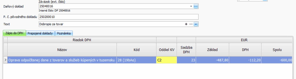 - V evidencii DPH je doplnený Oddiel KV – C2,