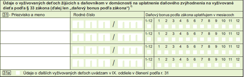 Ak dieťa nemá rodné číslo vydané na území SR, tak sa uvedie v r. 31 v DPFO typ A alebo v r. 33 v DPFO typ B, dátum narodenia dieťaťa v tvare DDMM/RRRR – pred lomítkom sa uvedie DDMM sprava (prvé 2 políčka ostanú prázdne) a za lomítkom sa uvedie RRRR.