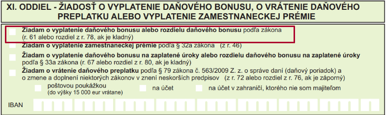 Ak je kladná hodnota v. r. 61 v DPFO typ A alebo rozdiel z r. 78 v dodatočnom DPFO typ A, v oddiely XI. bude vyznačená voľba „Žiadam o vyplatenie daňového bonusu alebo rozdielu daňového bonusu podľa zákona“