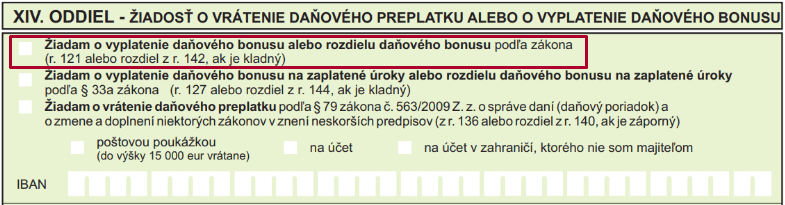 Ak je kladná hodnota v r. 121 v DPFO typ B alebo rozdiel z r. 142 dodatočného DPFO typ B, v oddiely XIV. bude vyznačená voľba „Žiadam o vyplatenie daňového bonusu alebo rozdielu daňového bonusu podľa zákona“.
