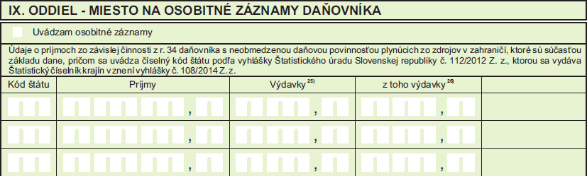- daňovník/rezident uvedie údaje o zdaniteľných príjmov a daňových výdavkoch dosahovaných zo zdrojov v zahraničí, ktoré sú súčasťou čiastkových základov dane, osobitného základu dane z kapitálového majetku podľa § 7, z podielov na zisku a ostatných príjmov § 51e, a z príjmov zo štátnych dlhopisov a štátnych pokladničných poukážok, ktoré sú súčasťou osobitného základu dane podľa § 51ea zákona.