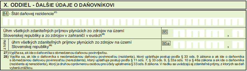 - vyplní daňovník/rezident, ak má príjmy zo závislej činnosti zo zdrojov v zahraničí, ktoré sú uvedené v r. 34 a zároveň vstupujú aj do r. 85