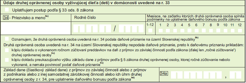 - údaje o druhej oprávnenej osobe vypĺňa daňovník, ktorý chce využiť možnosť navýšenia svojho základu dane o základ dane 2. oprávnenej osoby. Tento spôsob môže použiť vtedy, ak dosiahol nízky základ dane a výpočtom mu vyšiel nižší daňový bonus.