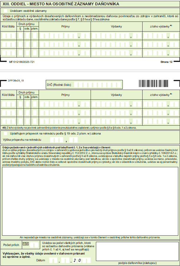 XIII. ODDIEL – MIESTO NA OSOBITNÉ ZÁZNAMY DAŇOVNÍKA