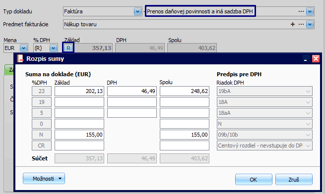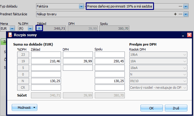 - V Základe kliknite na „R“, vo formulári Rozpis sumy rozpíšte sumy pre konkrétne DPH. Sumu prenosu daňovej povinnosti doplňte do riadku pre N – sadzbu.