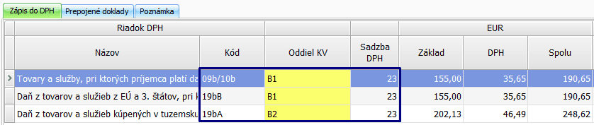 - Vo formulári DPH sú doplnené riadky DPH pre „tuzemské samozdanenie“ 09b/10b a 19bB – oddiel KV B1 – Sadzba DPH– 23 %.