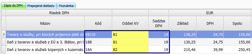 - Vo formulári DPH sú doplnené riadky DPH pre „tuzemské samozdanenie“ 09/10 a 18B – oddiel KV B1 – Sadzba DPH– 19 %.