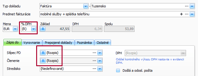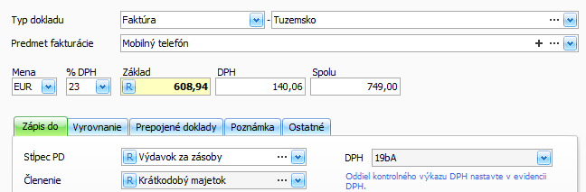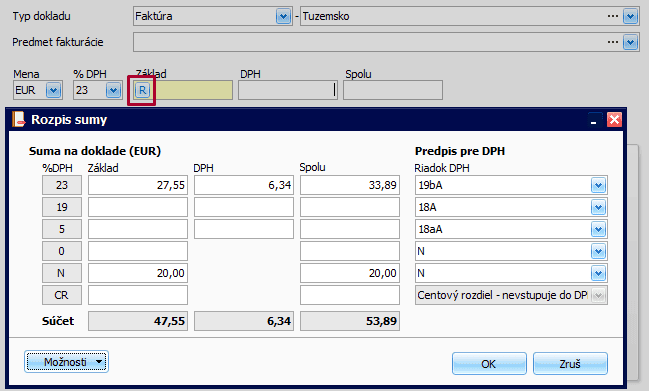 - v poli Základ kliknite na R. Vo formulári v riadku pre 23% DPH doplňte sumu mesačného paušálu. Splátku telefónu doplňte do N – sadzby DPH.