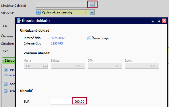 - vo formulári Úhrada dokladu v časti Uhradiť prepíšte sumu na 200 eur a potvrďte.
