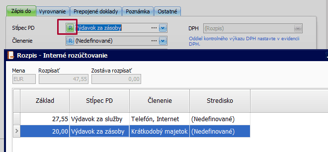 - Na záložke Zápis do v poli Stĺpec PD kliknite na tlačidlo R. Vo formulári rozúčtujte sumu z pohľadu dane z príjmov. Tlačidlom Oprav vstúpte na zápis a opravte sumu za mesačný paušál a Stĺpec PD vyberte Výdavok za služby a podľa potreby doplňte členenie. Formulár uložte. Kliknite na Pridaj. Vyplňte sumu za mesačnú splátku telefónu a vyberte Stĺpec PD Výdavok za zásoby. Formulár uložte.