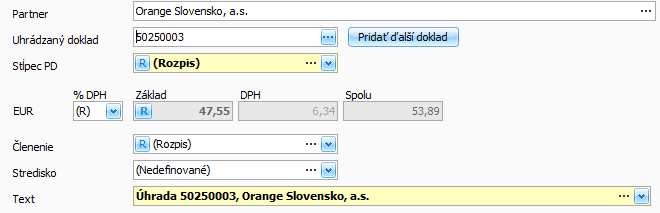 - v poli Uhrádzaný doklad vyberte uhrádzanú faktúru.