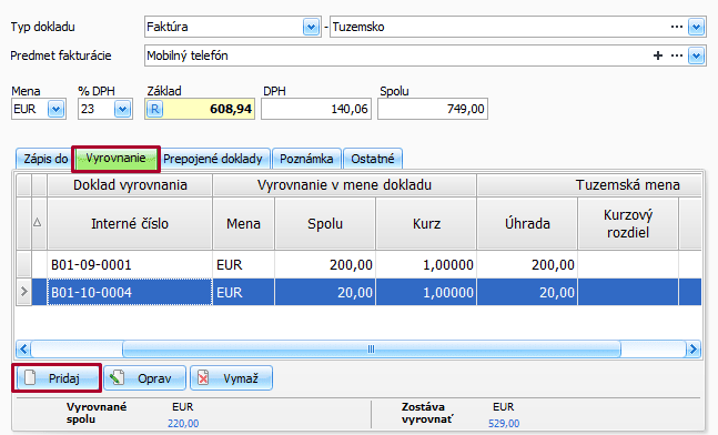 - na záložke Vyrovnanie kliknite na Pridaj,