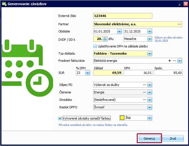 - v zobrazenom formulári Generovanie záväzkov vyplňte Externé číslo, Partnera,