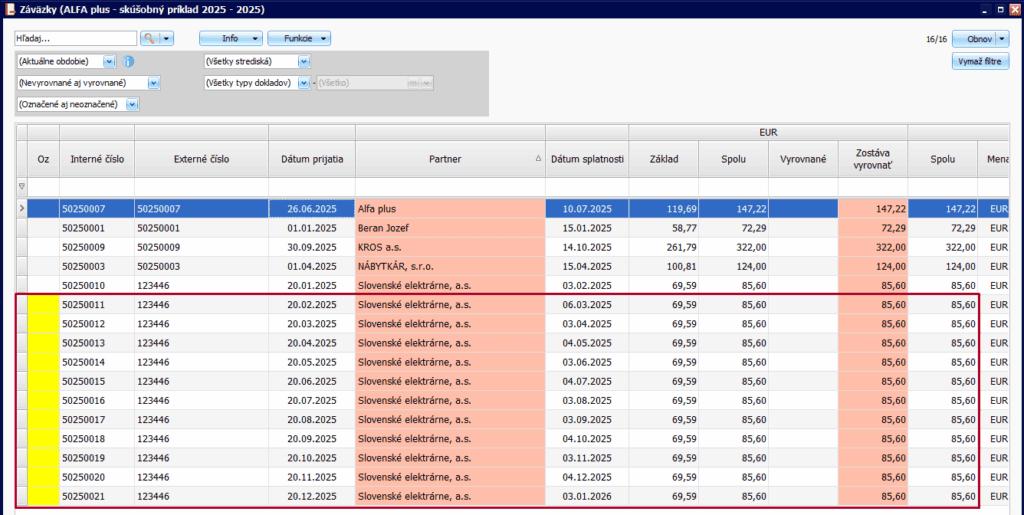 - Novo-vytvorené záväzky sa v evidencii označia žltou, resp. zvolenou farbou,