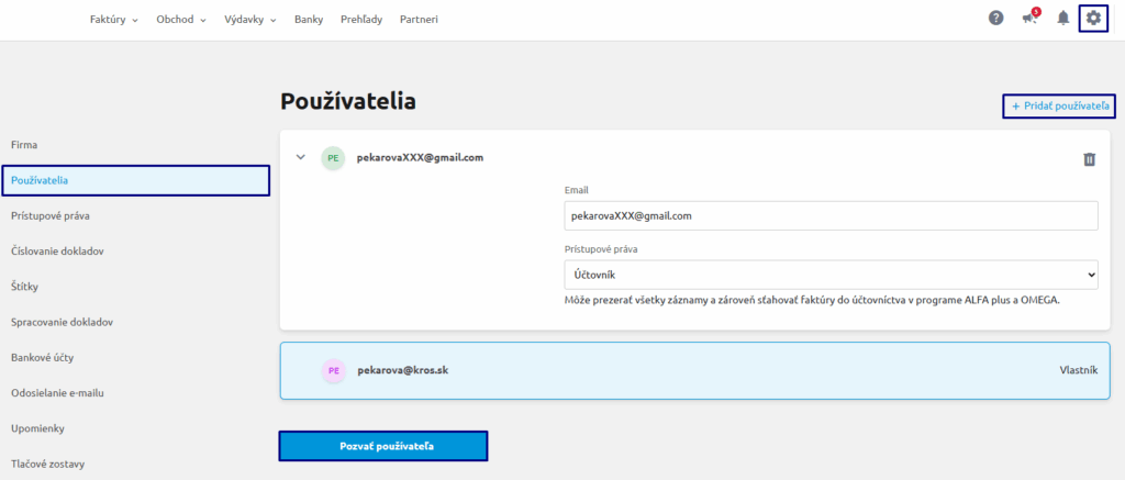 Cez Pridať používateľa vyplňte email, nastavte prístupové práva – účtovník a potvrďte Pozvať používateľa.